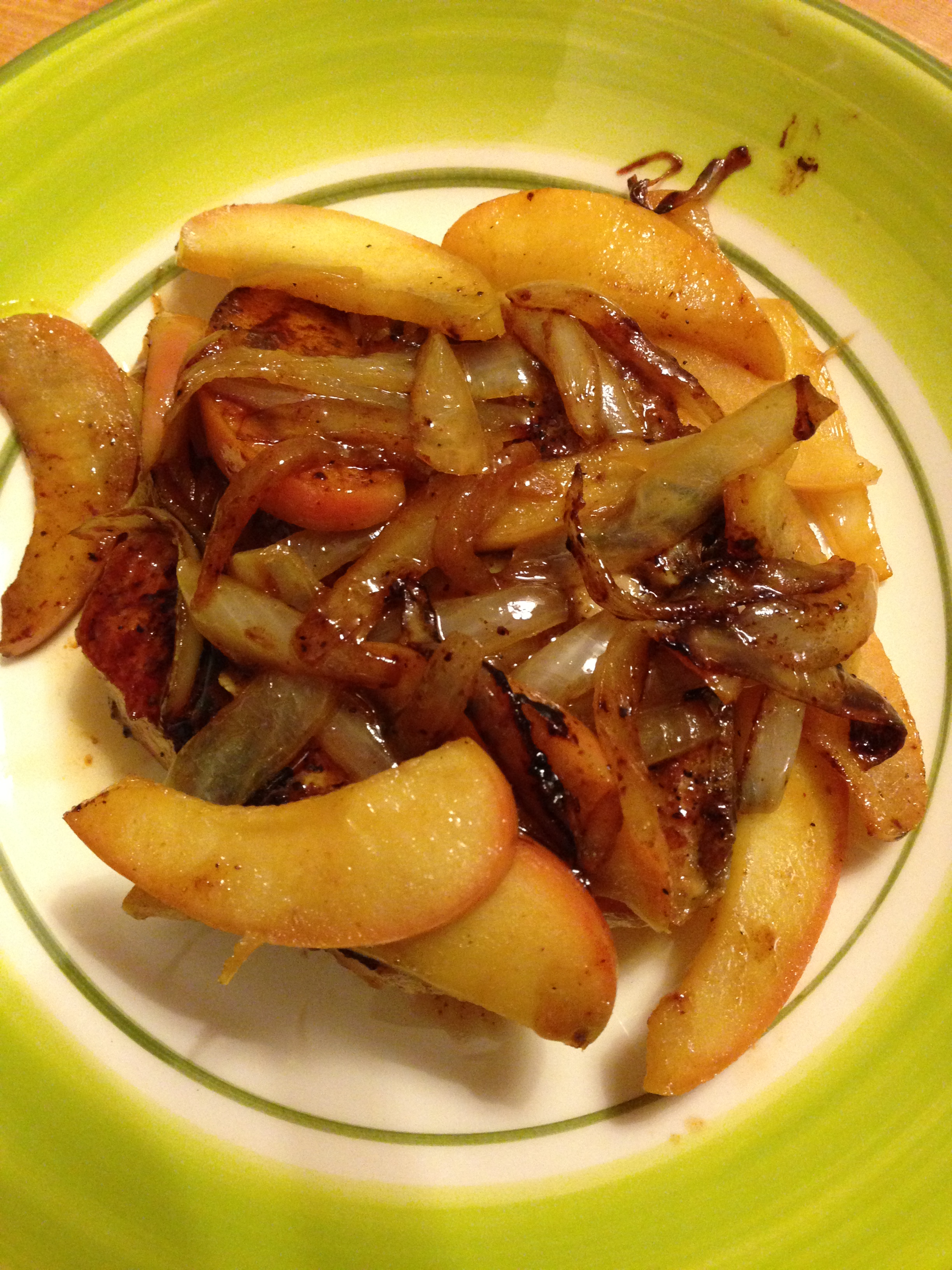 Return the chops and cook until tender (about 15 more minutes), turning halfway through and covering with the onion/apple mixture.  If the apple/onion mixture needs thickening, take the chops out and simmer the mixture for a few more minutes.  But you probably won’t need to do this.  Serve the chops with a large spoonful of the onion/apple mixture on top.  Voila!
