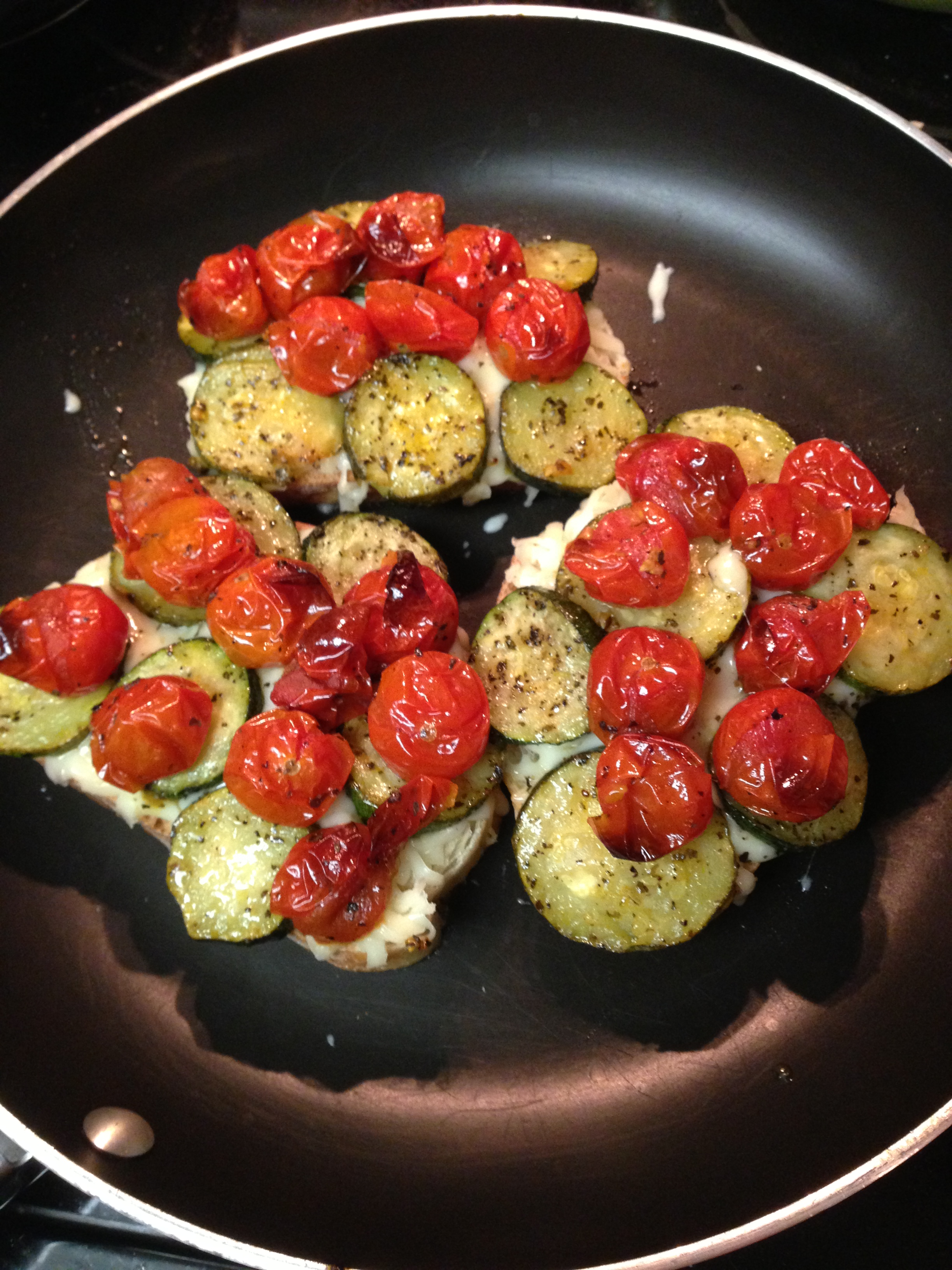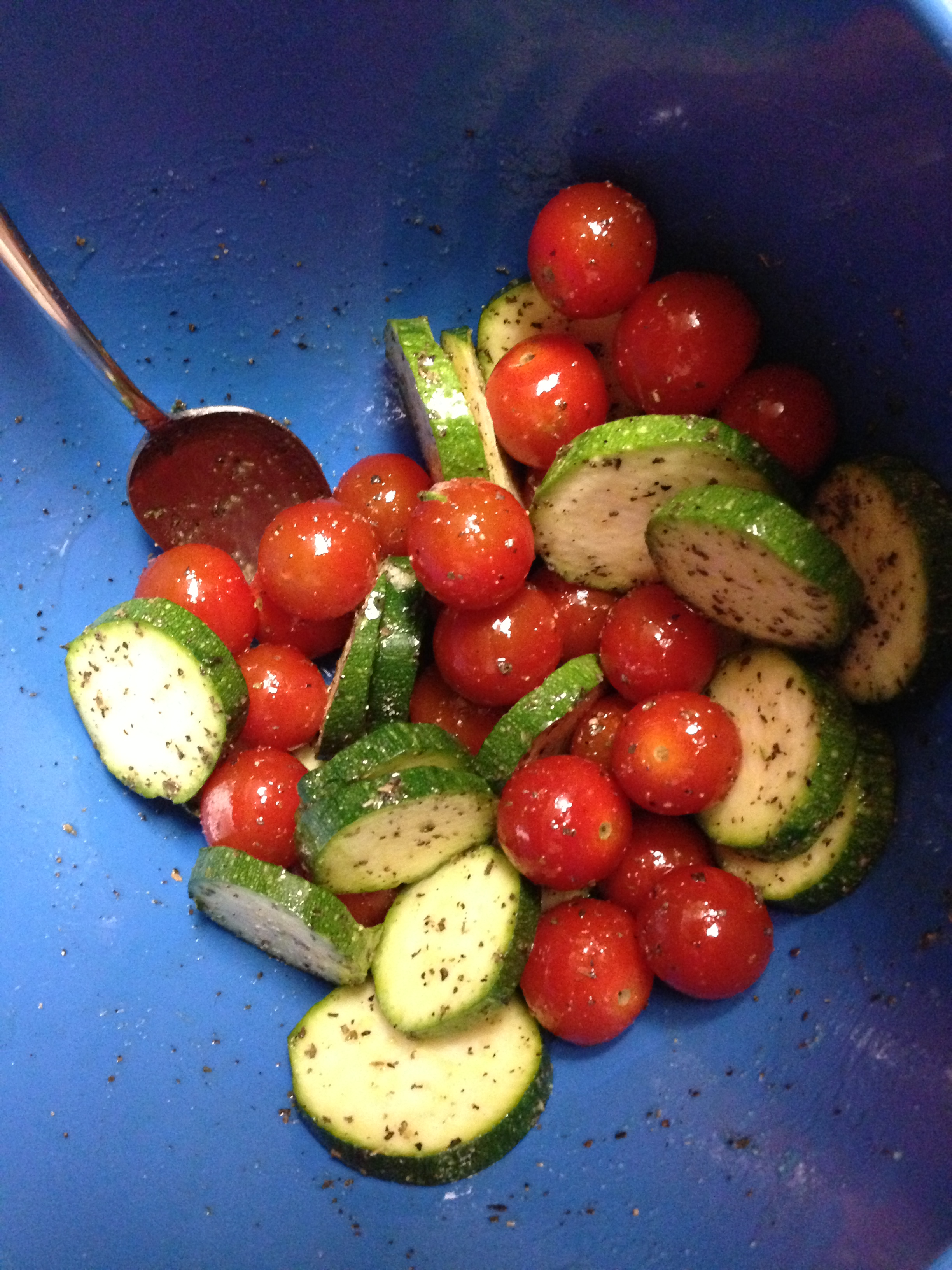Mix veggies (whichever ones you choose) with a splash of olive oil, pepper, salt, and some dried basil. Spread them out on a cookie sheet lined with parchment paper (yay, one less dish to do!) and roast at 350 until the tomatoes have burst and the zucchini is fully cooked through. If you have a grill, you could definitely grill these veggies instead of roasting them.