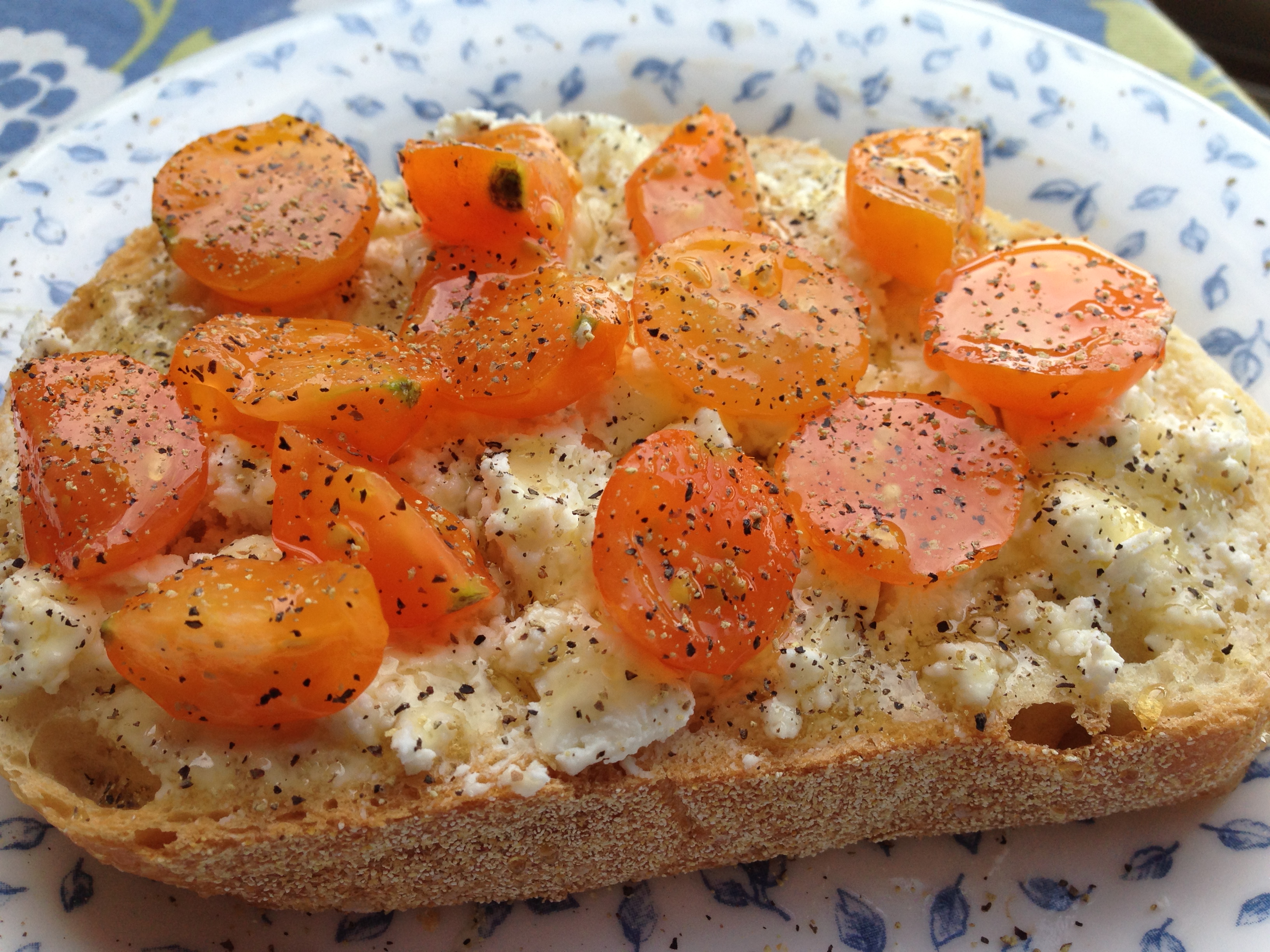 “Lunch” isn’t really a thing that happens here on the weekends. Sunday brunch is WAY too much food to warrant eating lunch, and Saturday breakfasts, though smaller, happen late enough in the day that lunch isn’t really necessary. So we usually just kind of graze, which is what I would rather do 99% of the time anyway (but I swear, I really do like cooking!). Since we had just returned from the farmers market with fresh cherry tomatoes and French bread, I decided to make a one-serving crostini for lunch. I spread goat cheese on a thick piece of toasted French bread, then topped it with some sliced cherry tomatoes, a drizzle of honey, and black pepper.