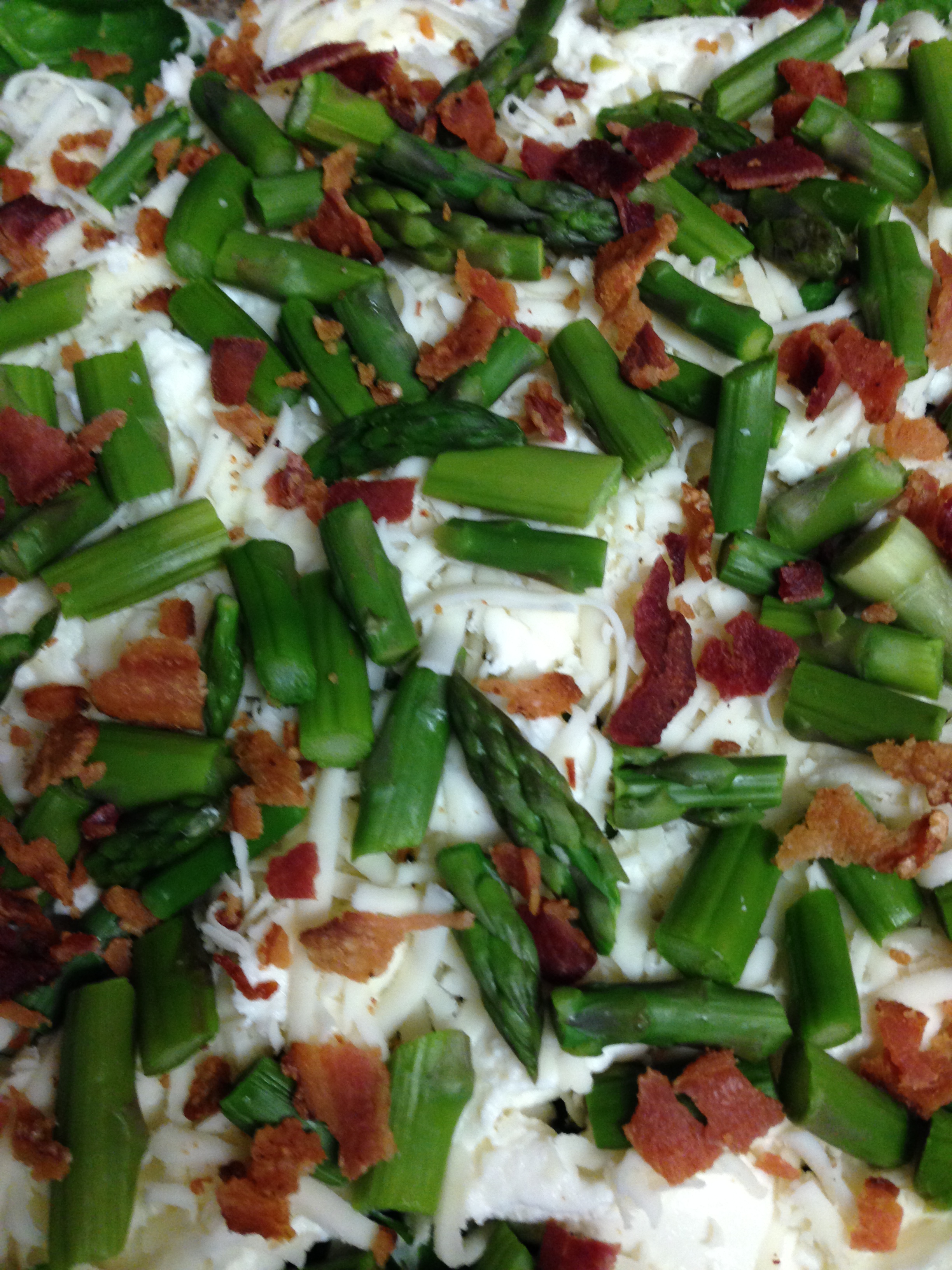Using a 12″ x 9″ baking dish, add about 1 c. of the cream sauce to the bottom of the dish as a coating, and then layer 4 of the cooked lasagna noodles over top of the sauce. Next, add 1 c. sauce to the noodles and spread evenly. Then add 2 c. baby spinach leaves and then 1 ¼ c. ricotta in small, even dollops over top. Next, add ½ c. mozzarella and ¼ c. four-cheese blend, and then about half of your asparagus pieces and half the pancetta. Repeat the layering process by adding another 4 cooked lasagna noodles over this, and press down gently to compact it a little bit; then add another 1 c. sauce, 2 c. baby spinach leaves, 1 ¼ c. ricotta cheese, ½ c. mozzarella, ¼ c. four-cheese blend, the remaining asparagus pieces, and the remaining pancetta. Finally, add the 4 remaining cooked lasagna noodles over top, pressing down again to compact the lasagna, and add 1 c. sauce, the remaining ½ c. mozzarella and remaining 1 ¼ c. four-cheese blend.