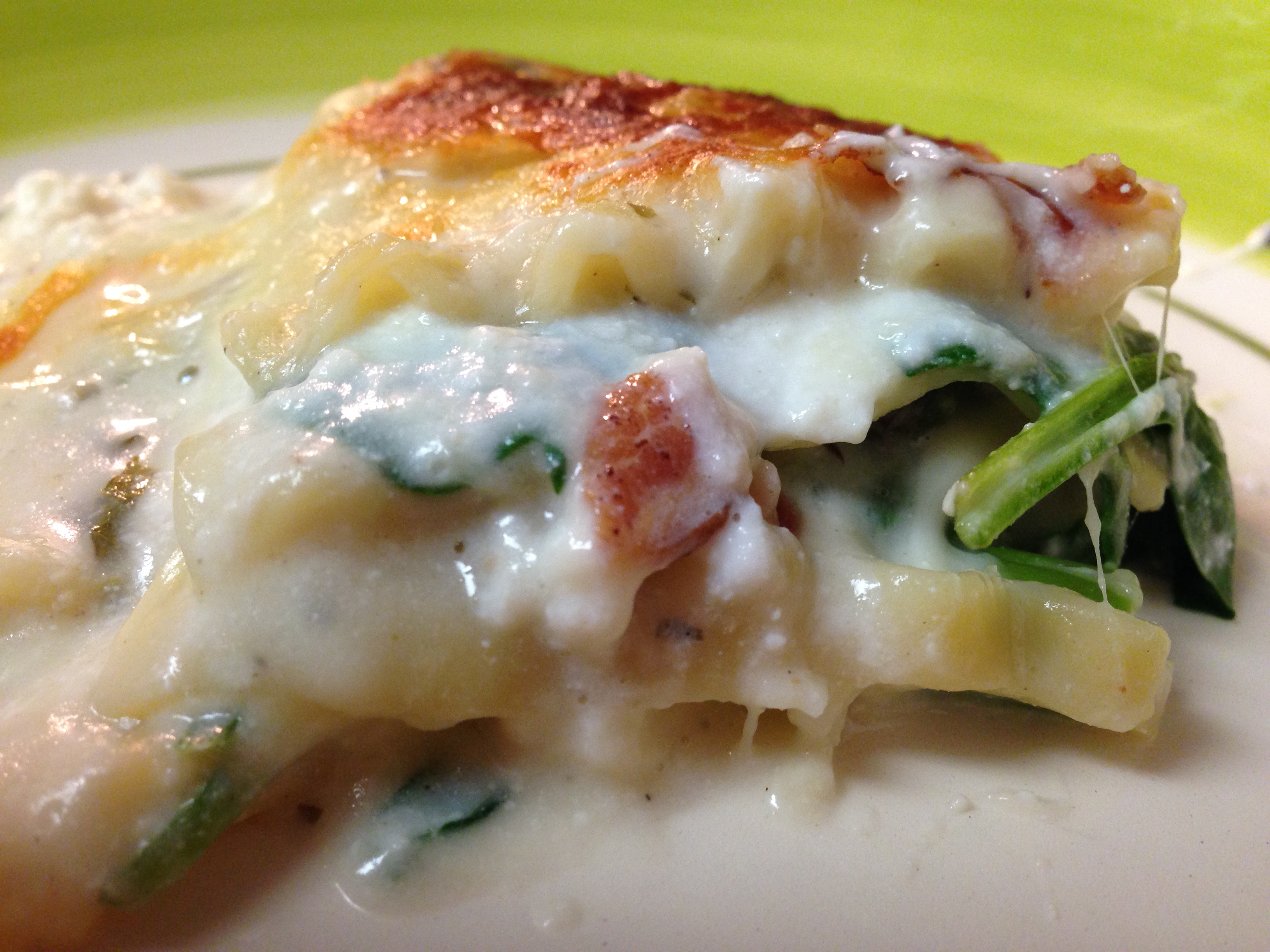 Cheesy Spinach-Asparagus Lasagna with Basil Cream Sauce (original recipe here)