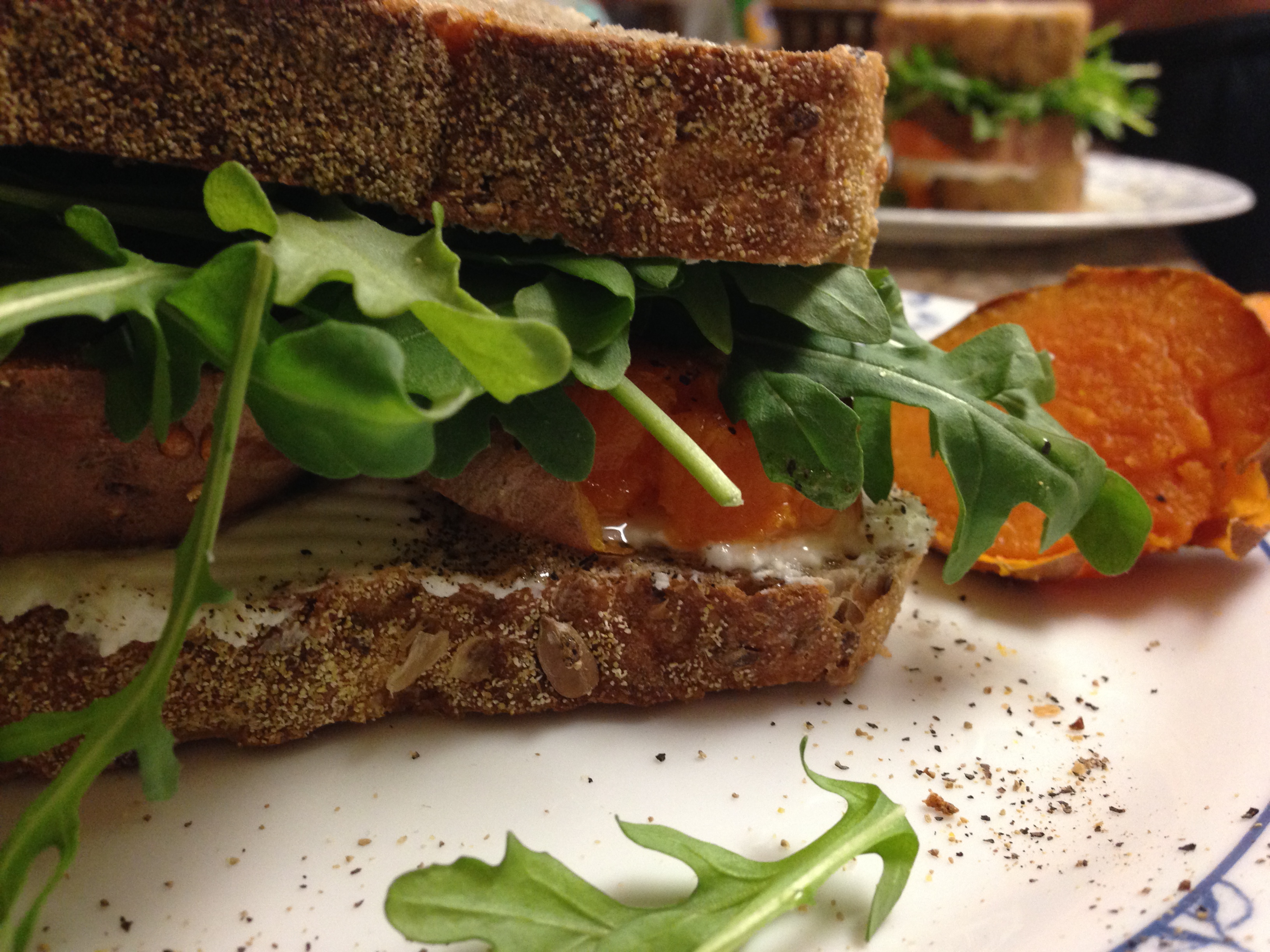In the meantime, toast bread.  Spread each slice with a bit of goat cheese and top two with big handfuls of arugula.  Slice sweet potato and layer on the other two slices.  Drizzle sweet potato with honey and a give it good dose of black pepper.  Assemble, eat (keep a fork handy for runaways), and repeat until you can’t eat another bite.