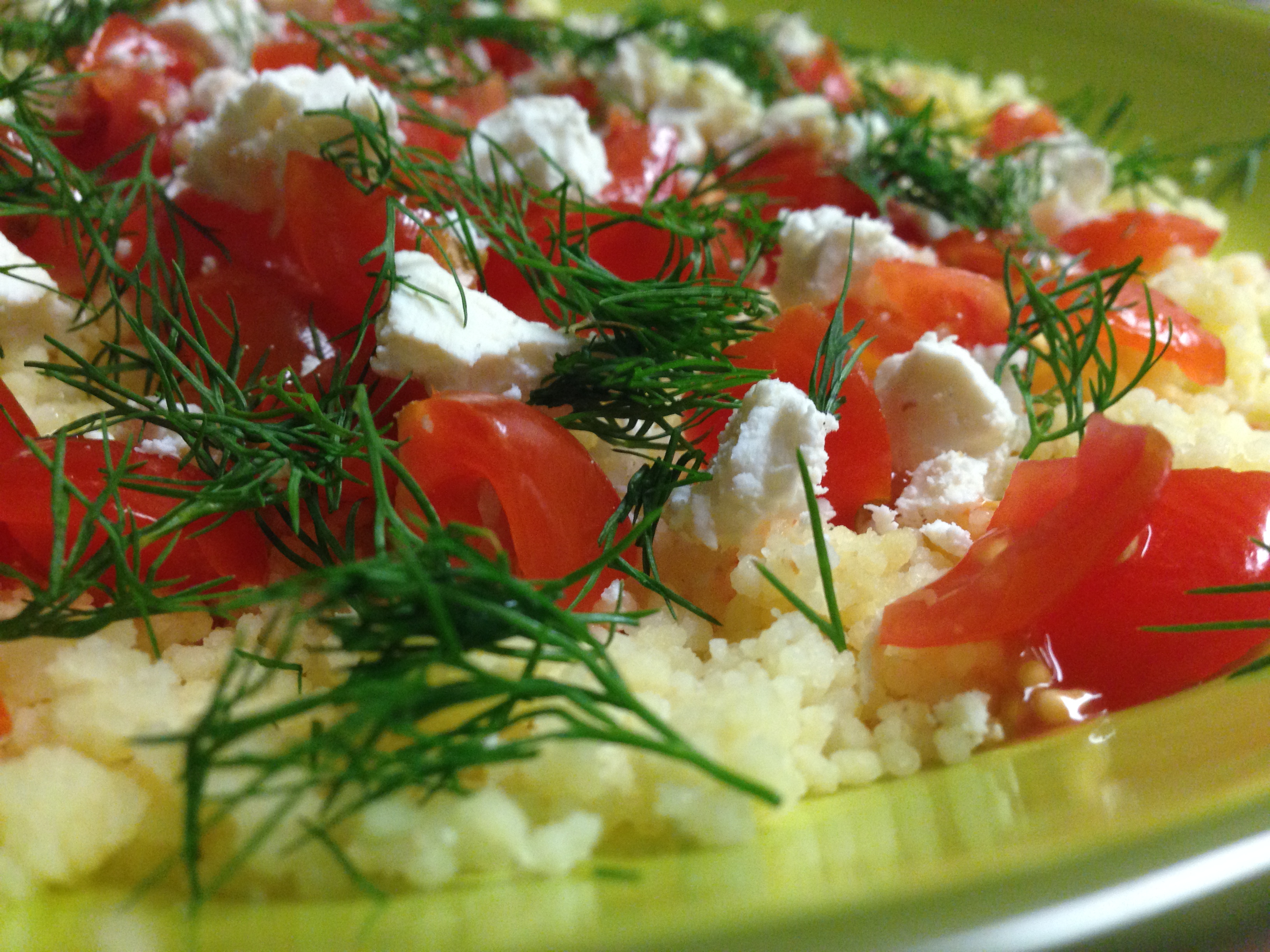 Tzatziki is absolutely delicious on pita chips, sliced veggies, and the like, you but you can also use it in more substantive meals. I bought a BIG bunch of dill to make this dip, so over the course of the next few days we had a lot of Greek-flavored meals. And no one was complaining because, umm, hello. You could make couscous, toss it with chopped dill, feta, and tomatoes, and then top it with a big dollop of tzatziki: