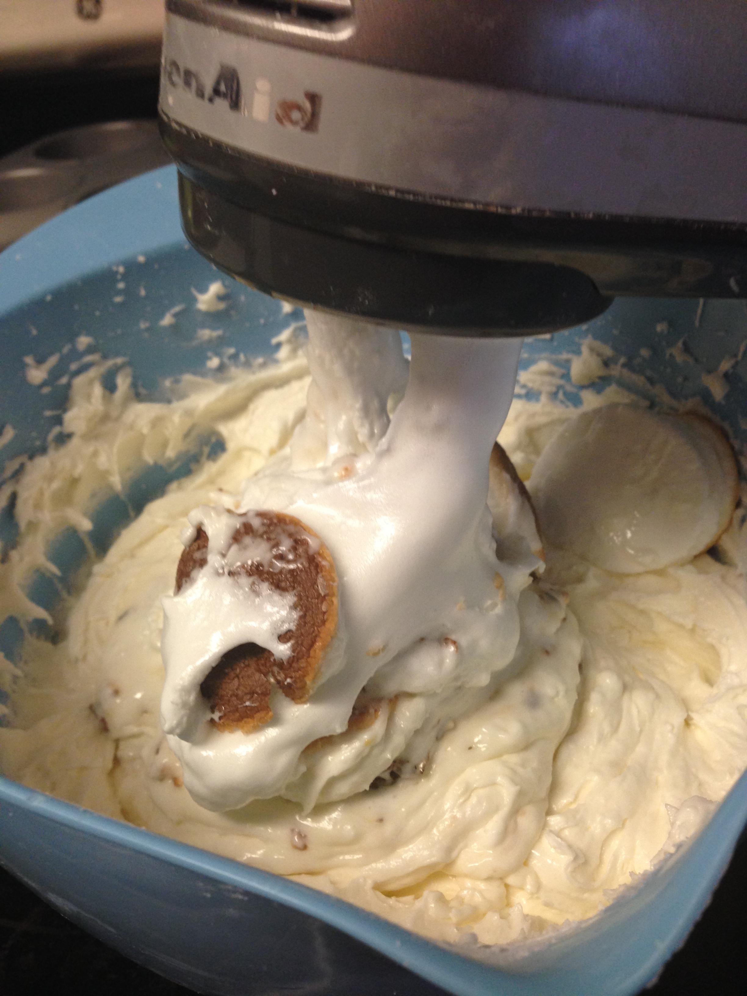 Beat butter, sugar, vanilla, and milk until fluffy. Line a cookie sheet with parchment paper and turn broiler on high. Toast marshmallows on cookie sheet for JUST a minute or two. Don’t blink, David Tennant fans, because those little guys will burn in a heartbeat. When they’re a beautiful dark toasty brown, take ’em out and mix into frosting. Stir them in a little first, though- -otherwise those sticky marshmallows will climb all the way up your mixer and make a HOLY mess. Allow frosting (and cake) to cool before frosting the cake.