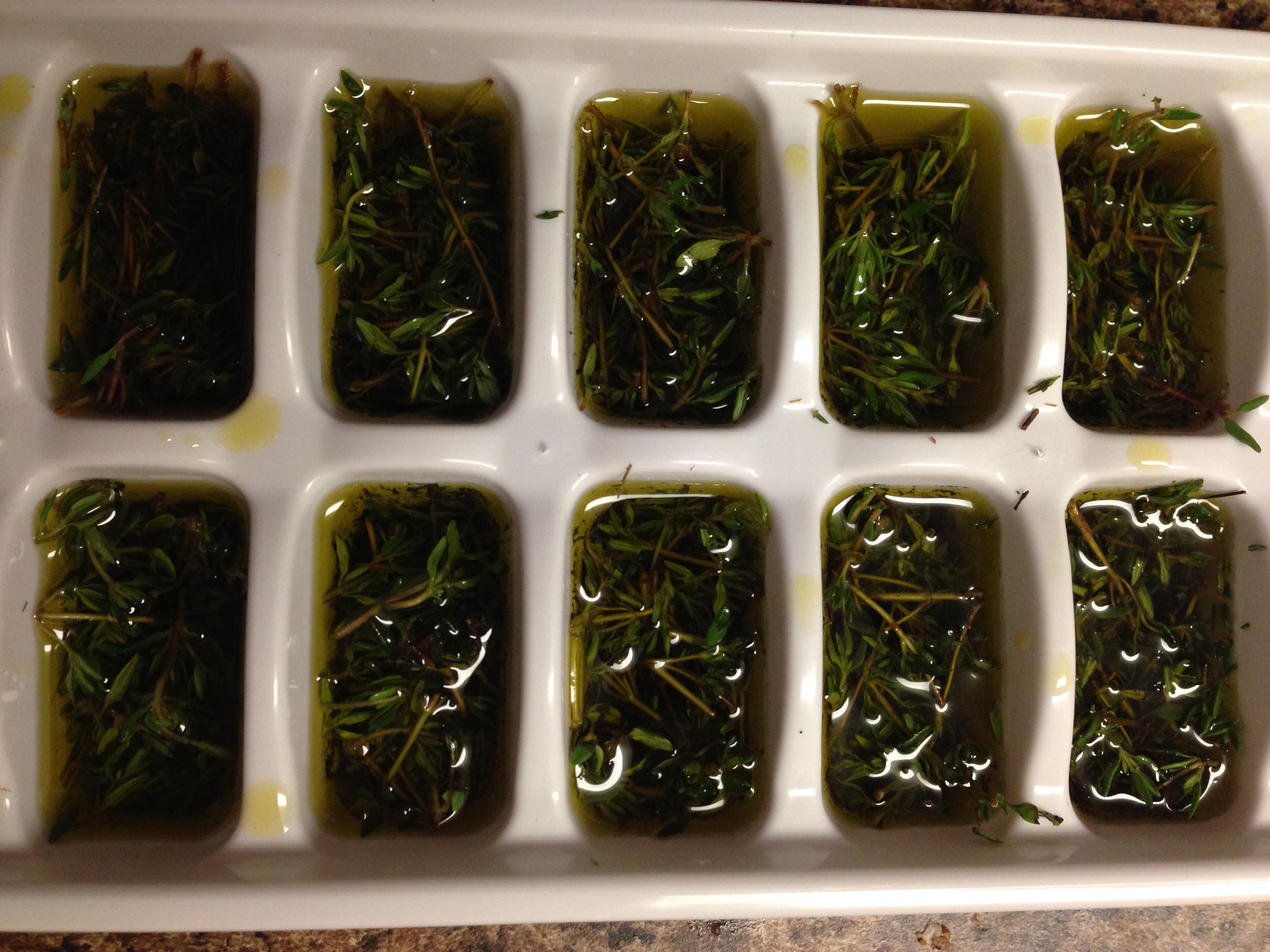 I put thyme in this frittata because I bought a ton of it at the farmer’s market, and I have been looking for every excuse I can find to use it up. Unfortunately, I knew I wasn’t going to be able to use all of it before it went bad, so I decided to freeze the rest of the thyme in olive oil until I need it.