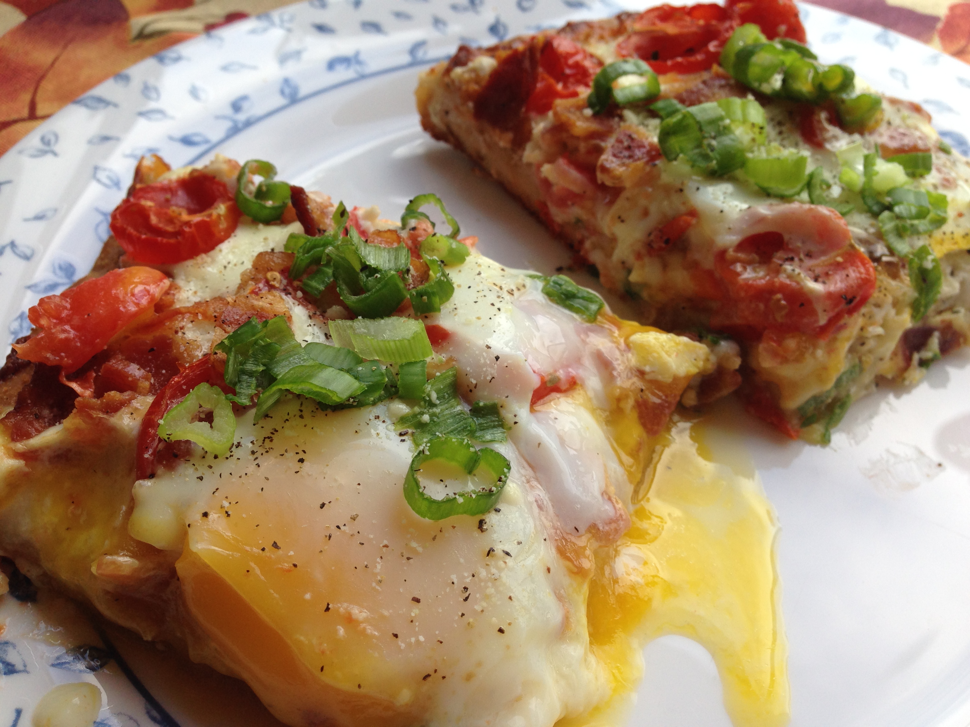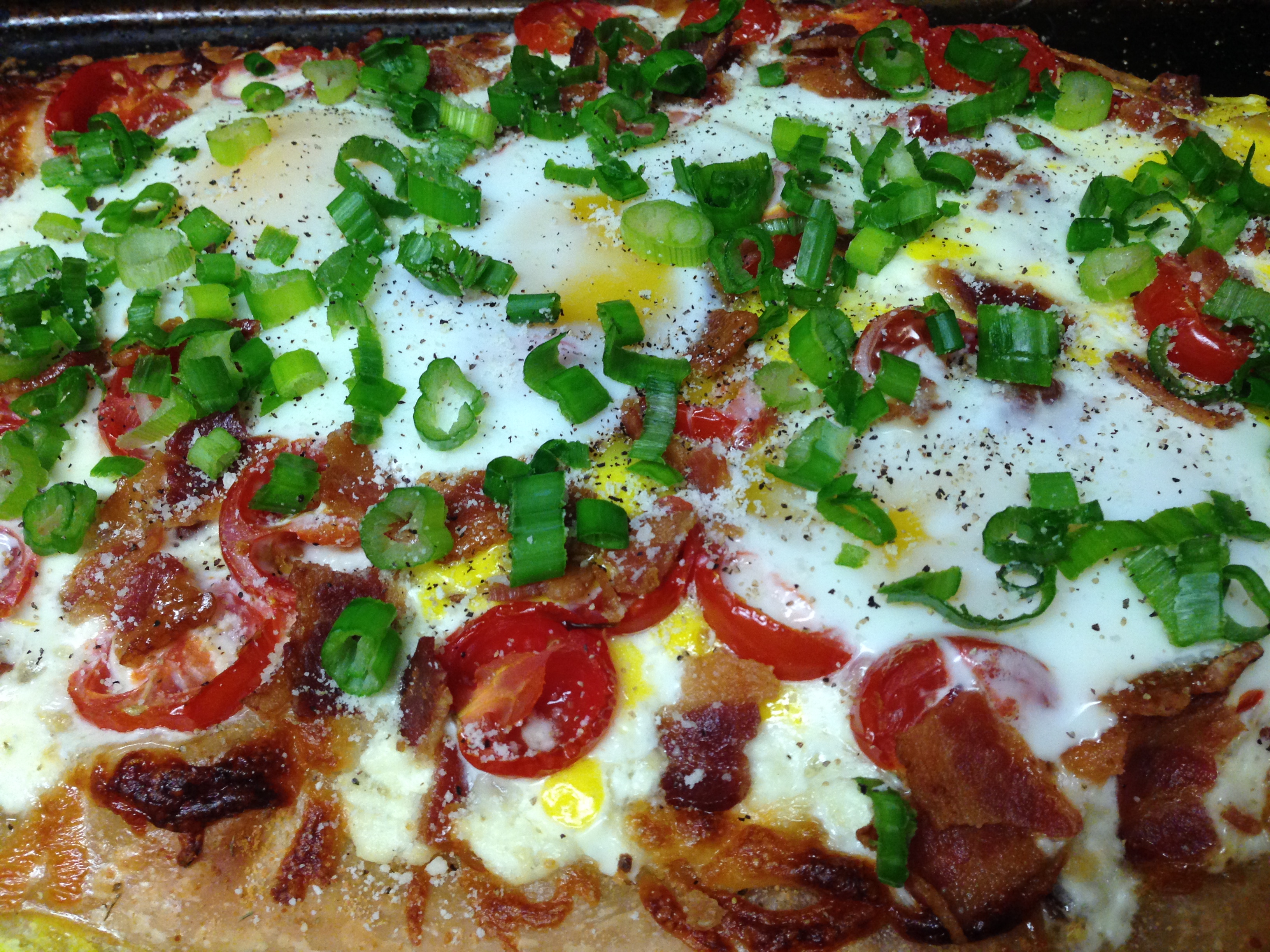 - If your crust needs to bake for more than 10 minutes (mine did), top it with everything but the eggs and scallions and cook the pizza until it has 10 minutes to go, then add the eggs. Overbaked eggs are not your friend.