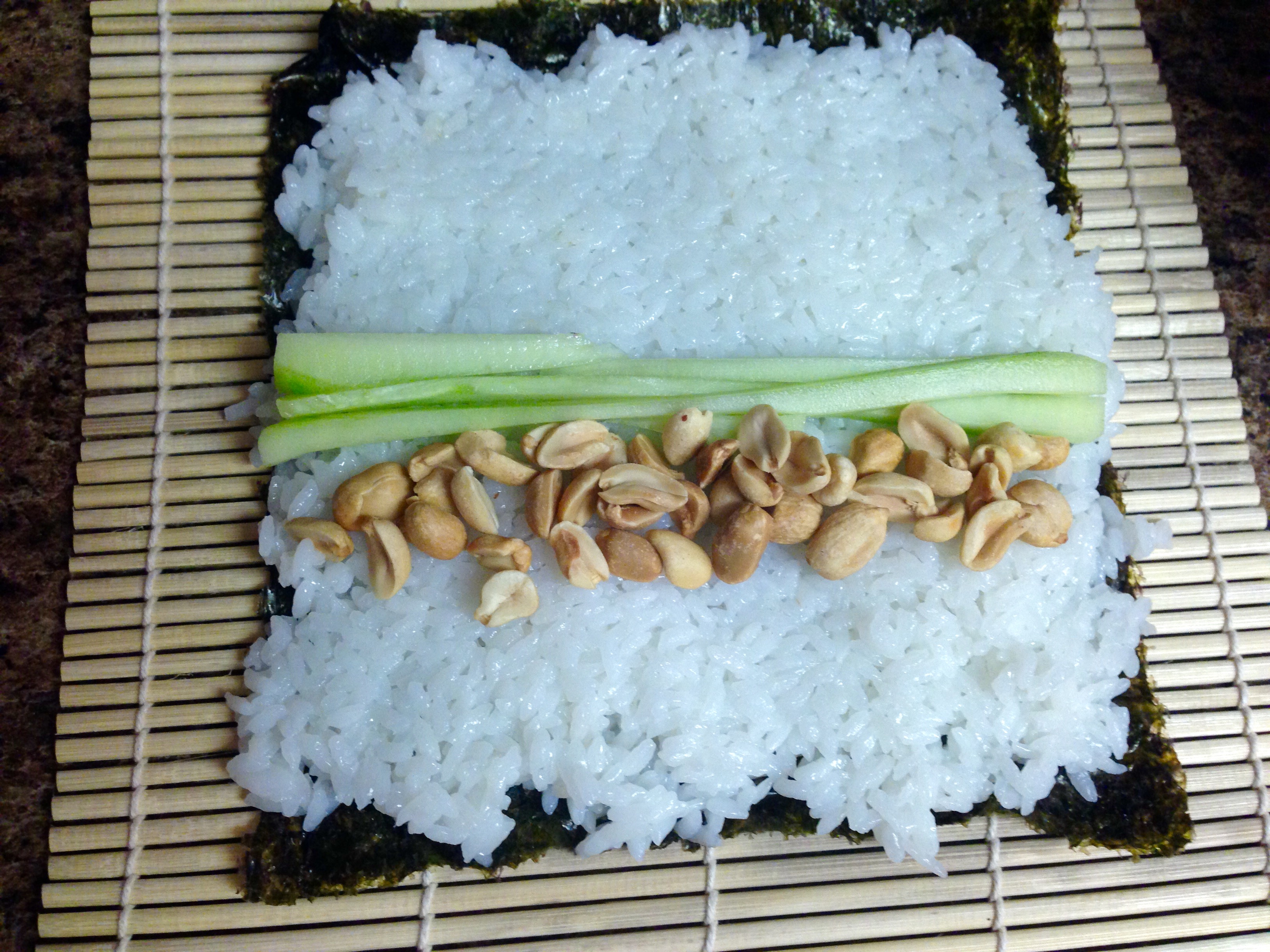 - Don’t overdo it on the rice. Oh my god, don’t. You need just a thin layer. You know how sushi’s always weirdly filling, even though it seems like it shouldn’t be? The more rice you have, the worse that’s going to be. And the harder it is going to be to roll it up.