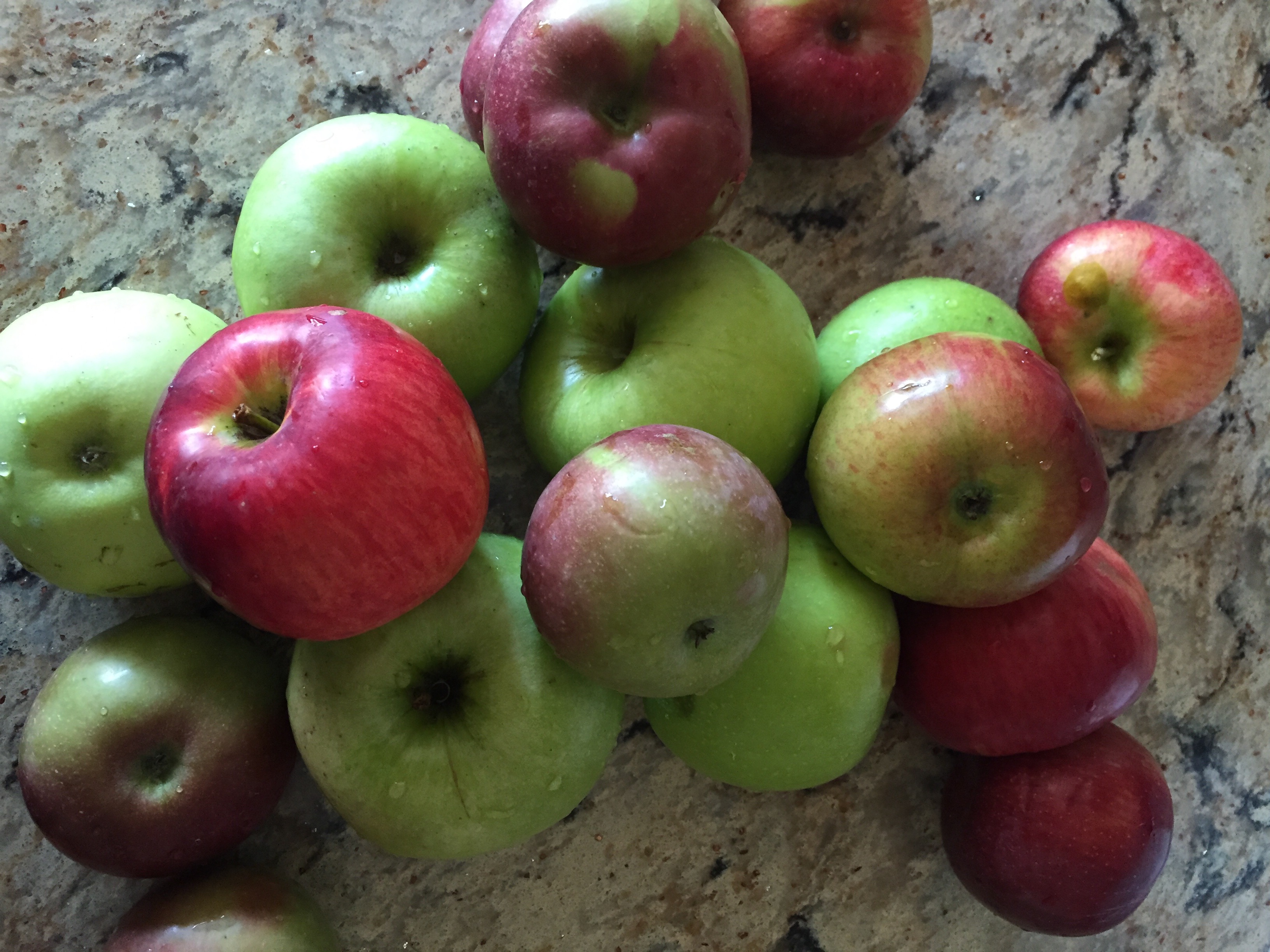 - I like to use a mix of different apple varieties; the more red apples you use, the pinker your final product will be (unless you peel them. But, like, why bother? The peels don’t go through the food mill anyway, so save yourself the work!)