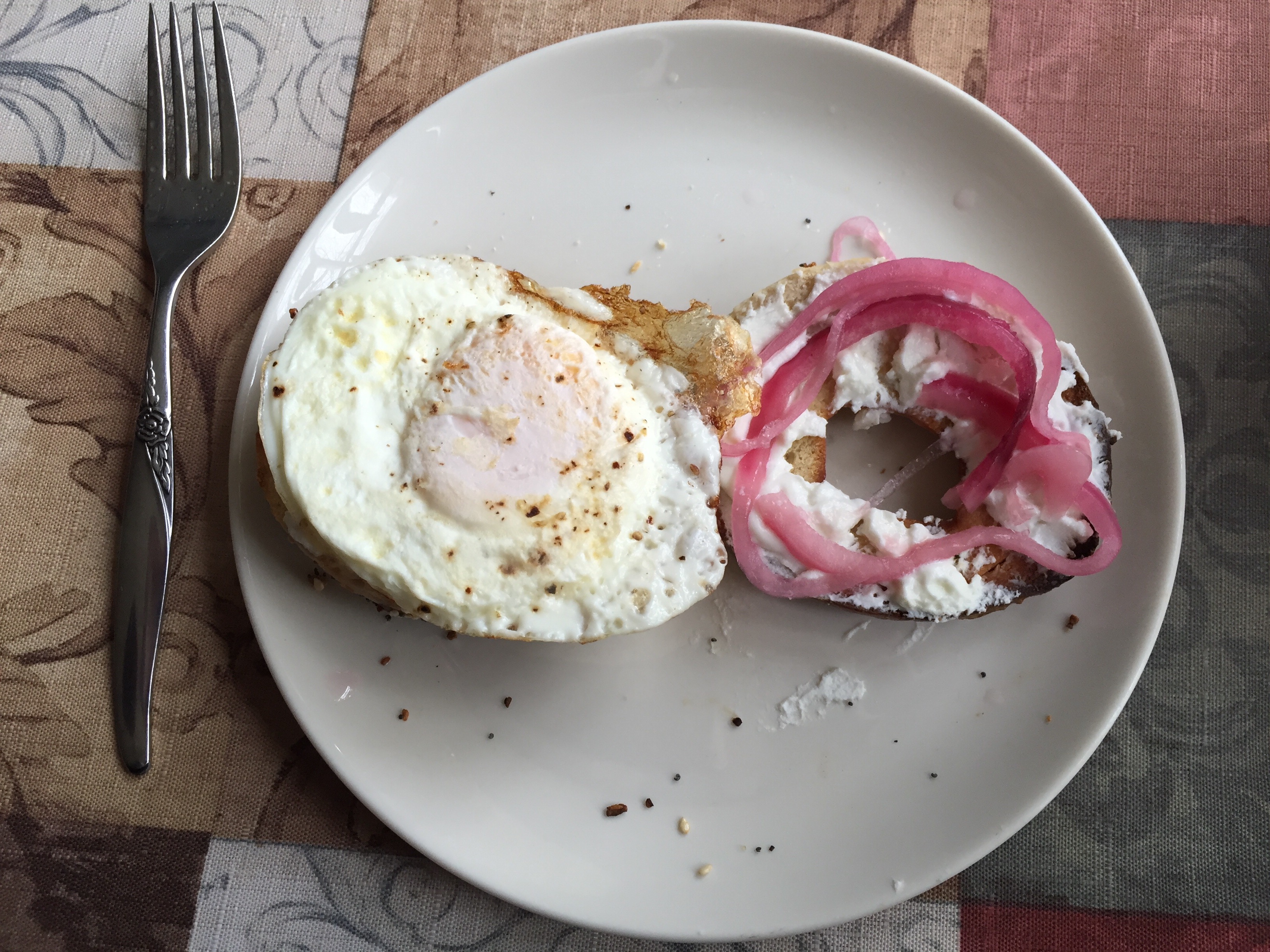- Once the egg is done to your taste, pop it on your bagel and devour.