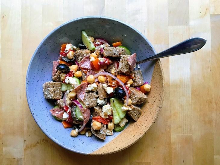 What I like about panzanella is that it’s infinitely riff-able, which makes it an excellent meal for eating seasonally, and also makes it the exact kind of flexible dish we need right now, when specific ingredients can be hard to find and we’re all minimizing grocery trips to help keep each other safe. Plus, since it seems like everyone and their mother has a sourdough starter now, it’s the perfect way to use up an abundance of bread when you get sick of toast! (Lol please, like that could ever happen.)